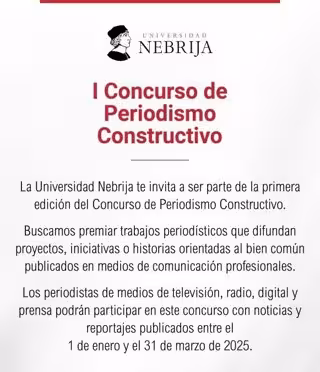 El Concurso de Periodismo Constructivo de la Universidad Nebrija se organiza con la intención de premiar trabajos publicados en medios de comunicación profesionales, en cualquier categoría (prensa escrita, digital, radio o televisión), centrados en la difusión de proyectos, iniciativas o historias personales que contribuyan al bien común, el progreso social y los Objetivos de Desarrollo Sostenible definidos por la Agenda 2030 de las Naciones Unidas.