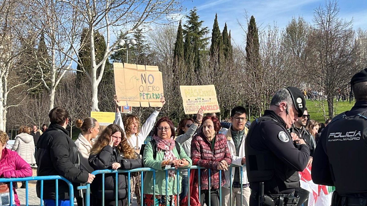 Decenas de personas se han concentrado esta mañana en los alrededores de la Glorieta de San Vicente para protestar contra la 'mascletá' organizada este domingo por el Ayuntamiento de Madrid, un evento pirotécnico que por primera vez llega a la ciudad en contra de los ecologistas y animalistas por el daño que supondrá al entorno natural de la zona.