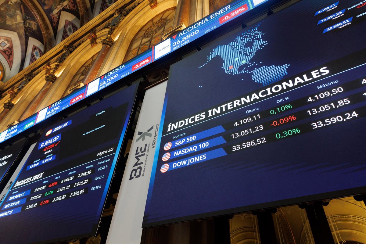 Archivo - Un panel del IBEX 35 en el Palacio de la Bolsa de Madrid, a 11 de abril de 2023, en Madrid (España). El Ibex 35 ha iniciado la sesión de hoy con una subida del 0,51%, hasta los 9.359 puntos, tras el parón de Semana Santa, en una jornada en la - Eduardo Parra - Europa Press - Archivo