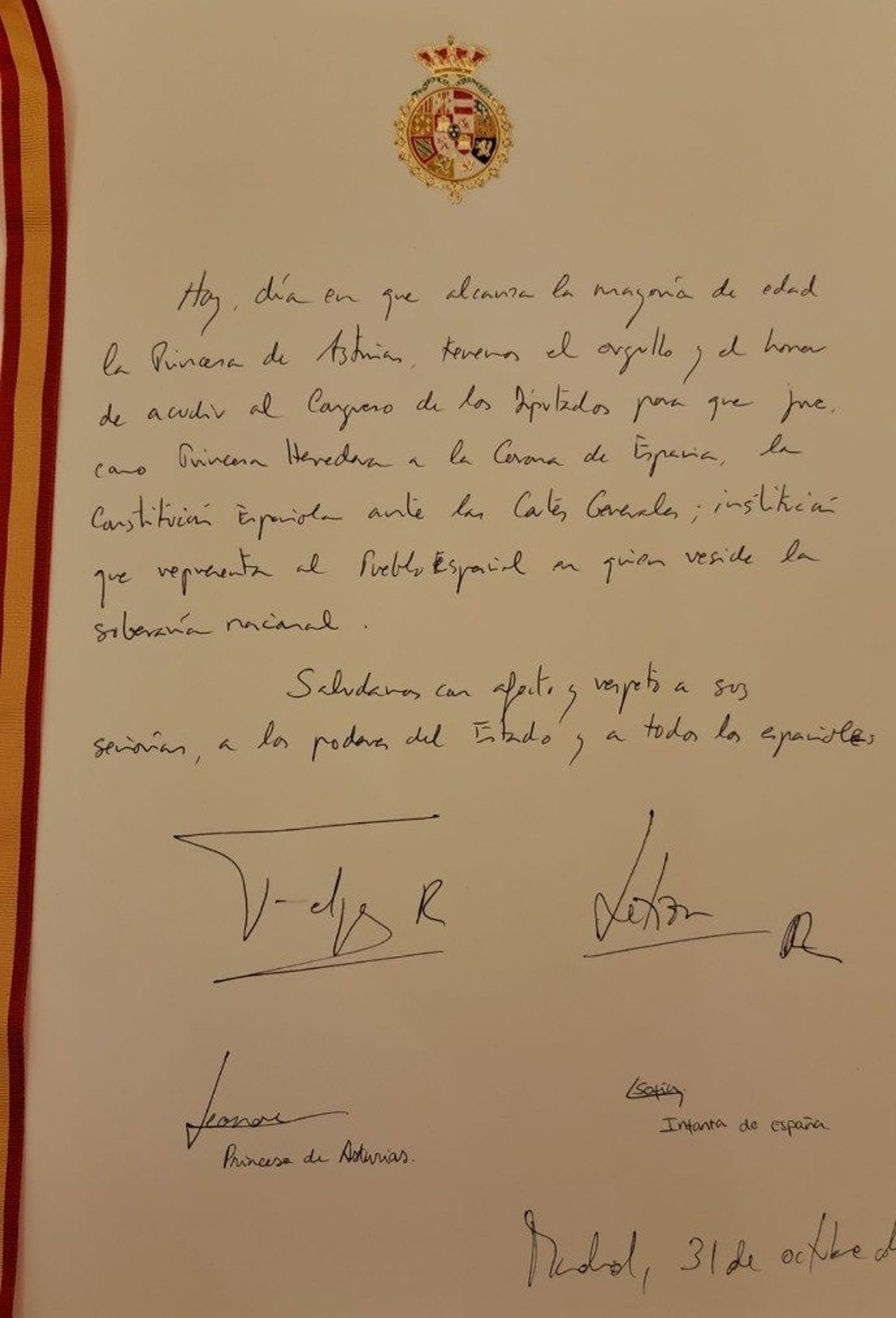 "Hoy, día en que alcanza la mayoría de edad la Princesa de Asturias, tenemos el orgullo y el honor de acudir al Congreso para que jure, como princesa heredera a la Corona de España, la Constitución Española ante las Cortes Generales; institución que representa al Pueblo Español, en quien reside la soberanía nacional", ha dejado escrito.