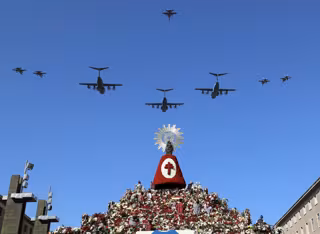 Archivo - Aviones del Ala 15 y 31 vuelan por encima de la Virgen del Pilar durante la tradicional ofrenda de flores en el día de su festividad, a 12 de octubre de 2022, en Zaragoza, Aragón (España). Este año la ofrenda celebra su 63 edición y se suman - Fabián Simón - Europa Press - Archivo
