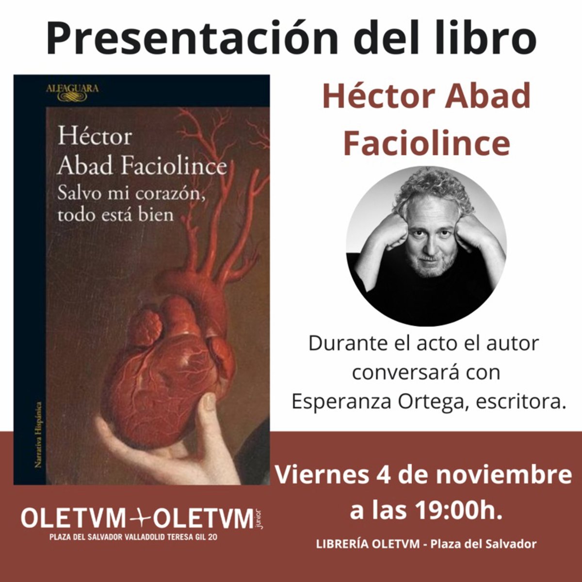 El escritor colombiano Héctor Abad Faciolince presentará este viernes, 4 de noviembre, su nueva novela, 'Salvo mi corazón, todo está bien' (Alfaguara), en Librería Oletvm de Valladolid (plaza del Salvador), a partir de las 19.00 horas.