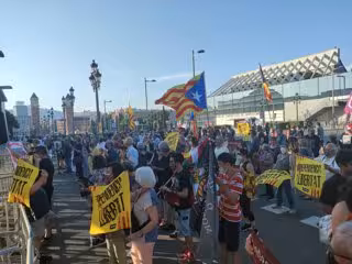 Los participantes han enarbolado banderas independentistas y carteles con el lema 'Ni rey ni corona', pancartas con el mensaje de 'Libertad' y rollos de papel higiénico con las caras del Rey Felipe VI, del rey emérito Juan Carlos I y de Francisco Franco.