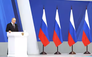 February 29, 2024, Moscow, Russia: Russian President Vladimir Putin delivers the annual address to the Federal Assembly at Gostiny Dvor, February 29, 2024 in Moscow, Russia. During the speech Putin threatened the west with nuclear weapons if NATO sends tr - Europa Press/Contacto/Gavriil Grigorov/Kremlin Poo