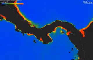 Concentraciones de clorofila extremadamente bajas en los océanos alrededor de Panamá (azul = bajo, rojo = alto) en febrero de 2025, revelando el fracaso del afloramiento de 2025 en el Golfo de Panamá, por primera vez en al menos 40 años. - AARON O'DEA