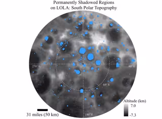 Esta ilustración muestra la distribución de las regiones permanentemente sombreadas (en azul) en la Luna, hacia el polo de los 80 grados de latitud sur.