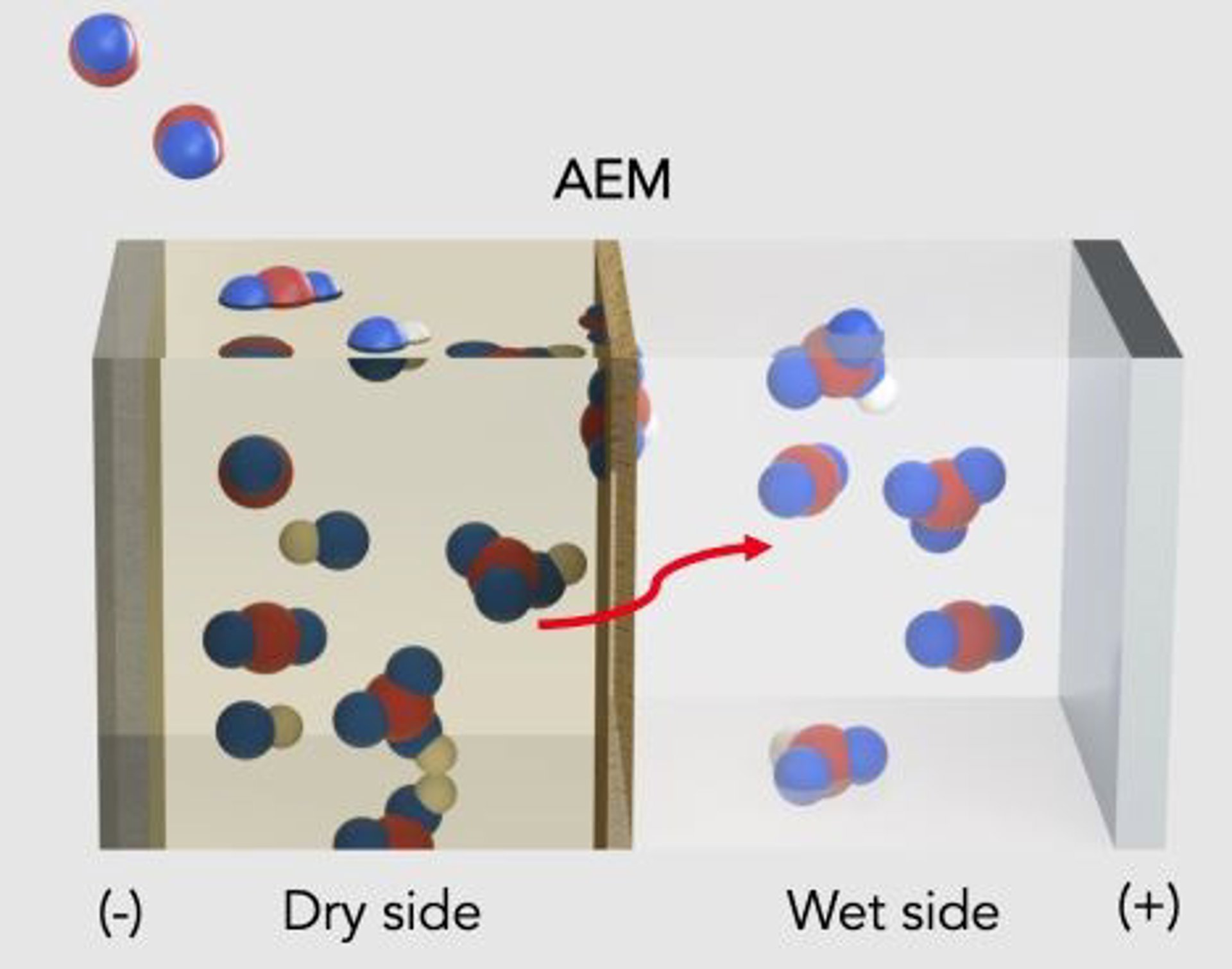 En el lado seco, un solvente orgánico se adhiere al dióxido de carbono disponible para producir una concentración de bicarbonato o bicarbonato de sodio en la membrana. A medida que se acumula el bicarbonato, estos iones cargados negativamente atraviesan la membrana hacia un electrodo cargado positivamente en una solución a base de agua en el lado húmedo de la membrana. La solución líquida disuelve el bicarbonato en dióxido de carbono, por lo que puede liberarse y aprovecharse para combustible u otros usos.