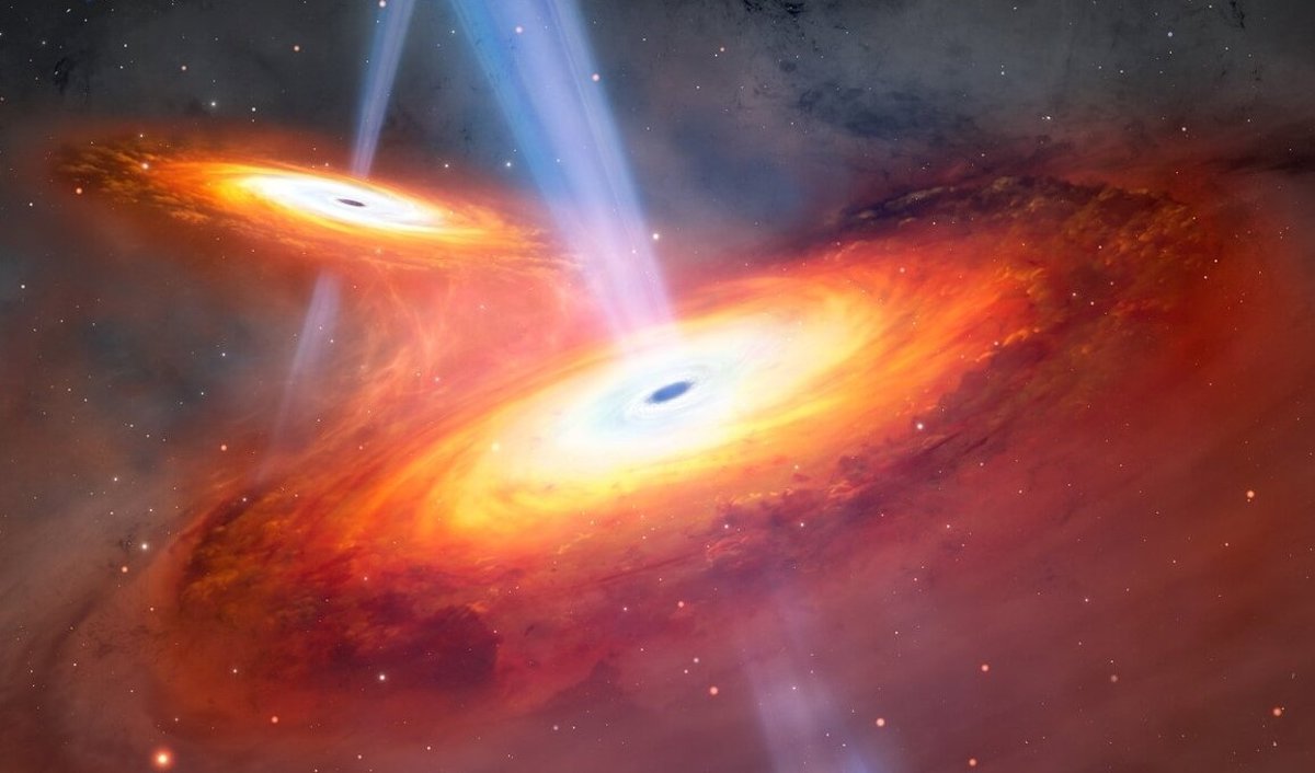 Con la ayuda del telescopio Gemini Norte, un equipo de astrónomos ha descubierto un par de cuásares fusionados vistos hace sólo 900 millones de años después del Big Bang.